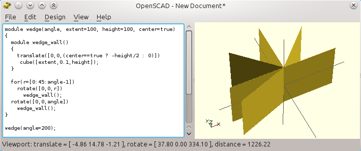 Now, for any angles smaller than 90°, we can create a "wedge" shape by means of a convex hull around two very thin slices (almost flat cuboids), where one of them is rotated by the expected angle (see, by the way how modules can be defined within modules).